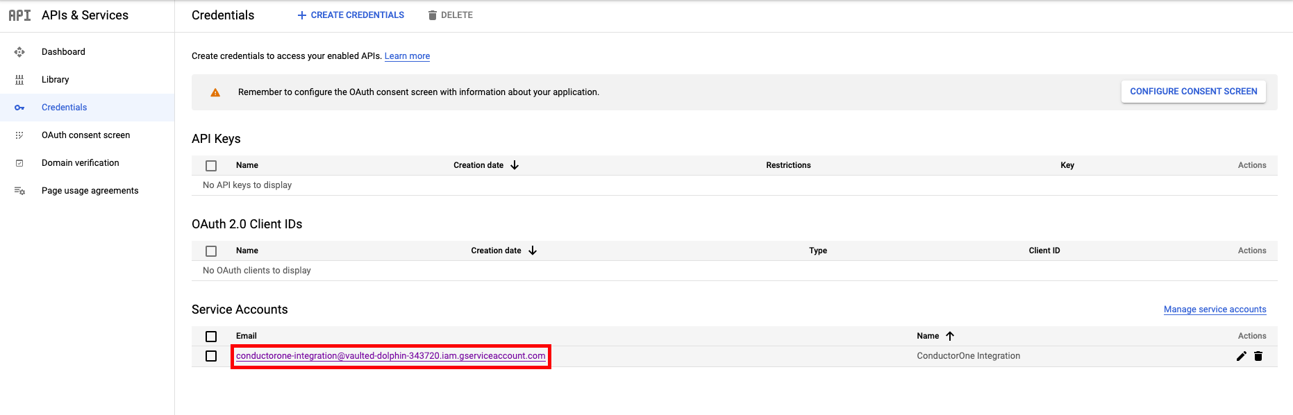 - Navigate back to APIs & Services > Credentials and select the service account you just created.