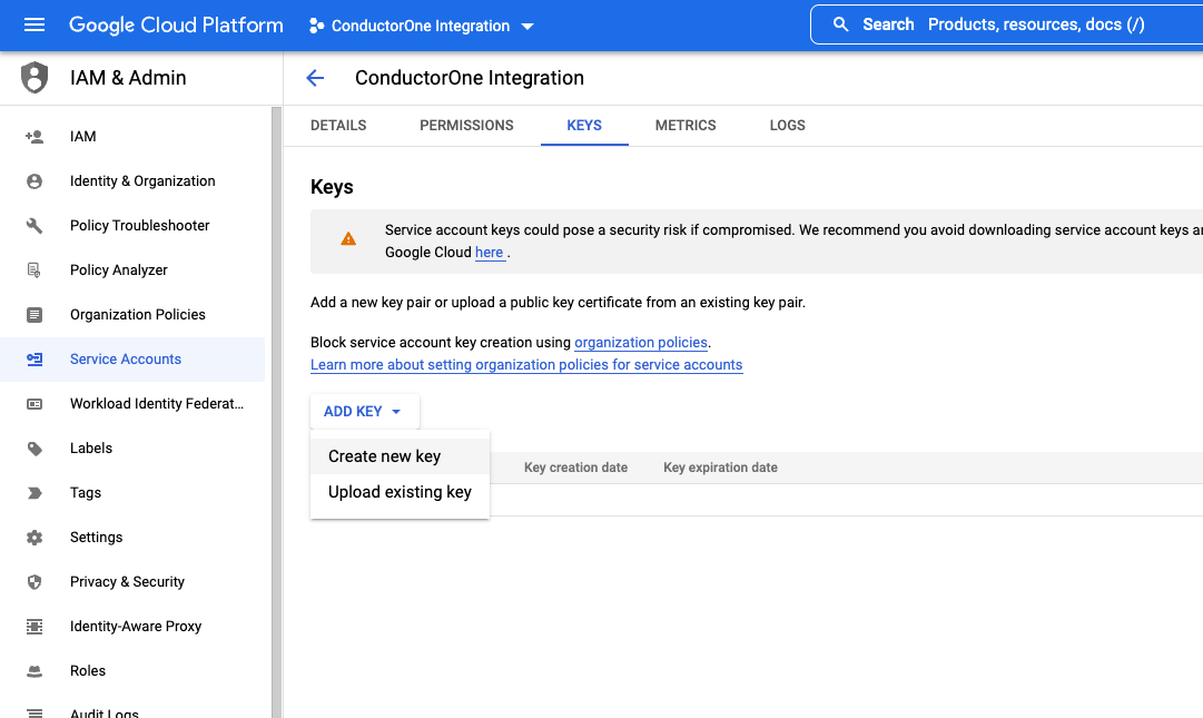 - Navigate back to APIs & Services > Credentials and select the service account you just created.