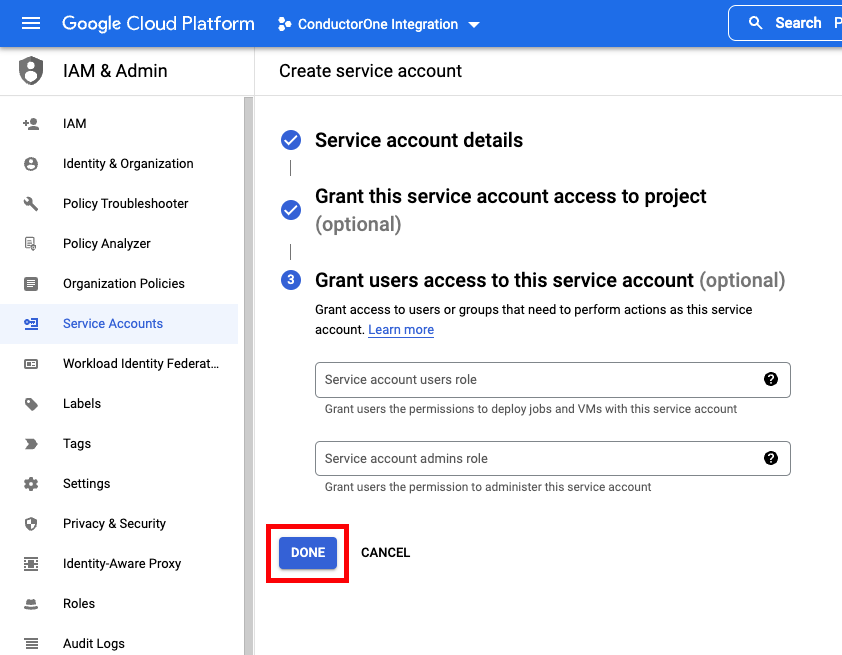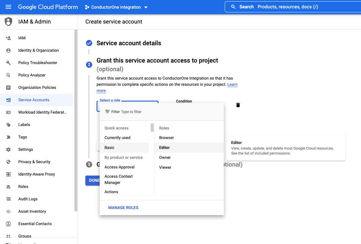 - Service account description: for example, “Service account for ConductorOne Google Workspace Integration”