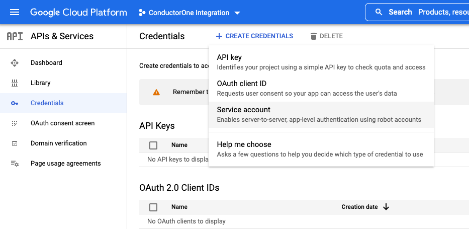 - Navigate back to APIs & Services > Credentials and select the service account you just created.