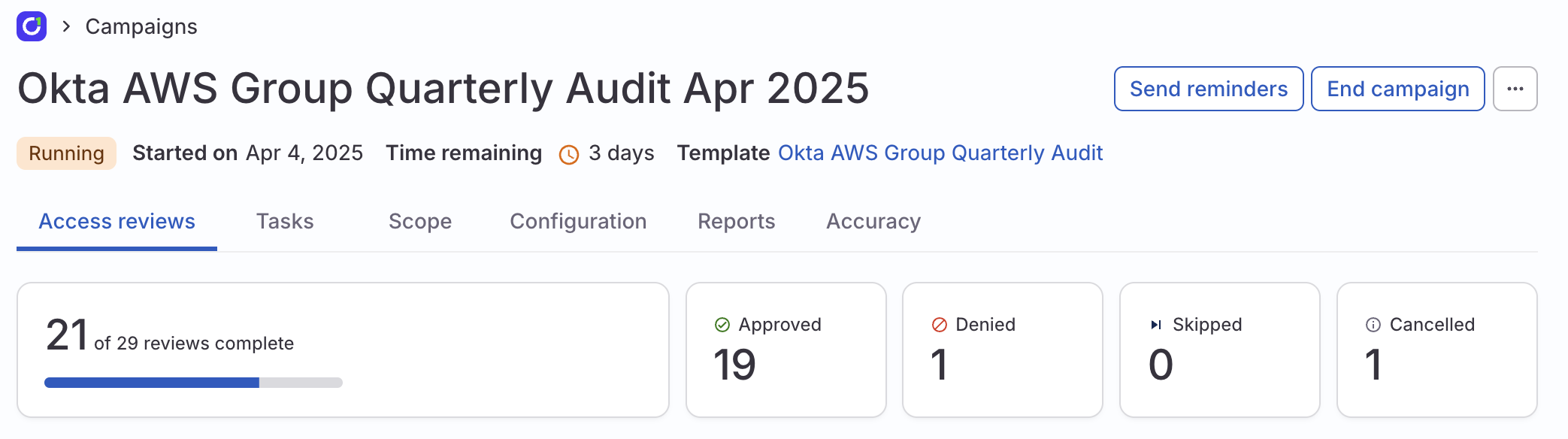 On the Access reviews tab of any campaign, view a dashboard summarizing the campaign’s progress and outstanding tasks.