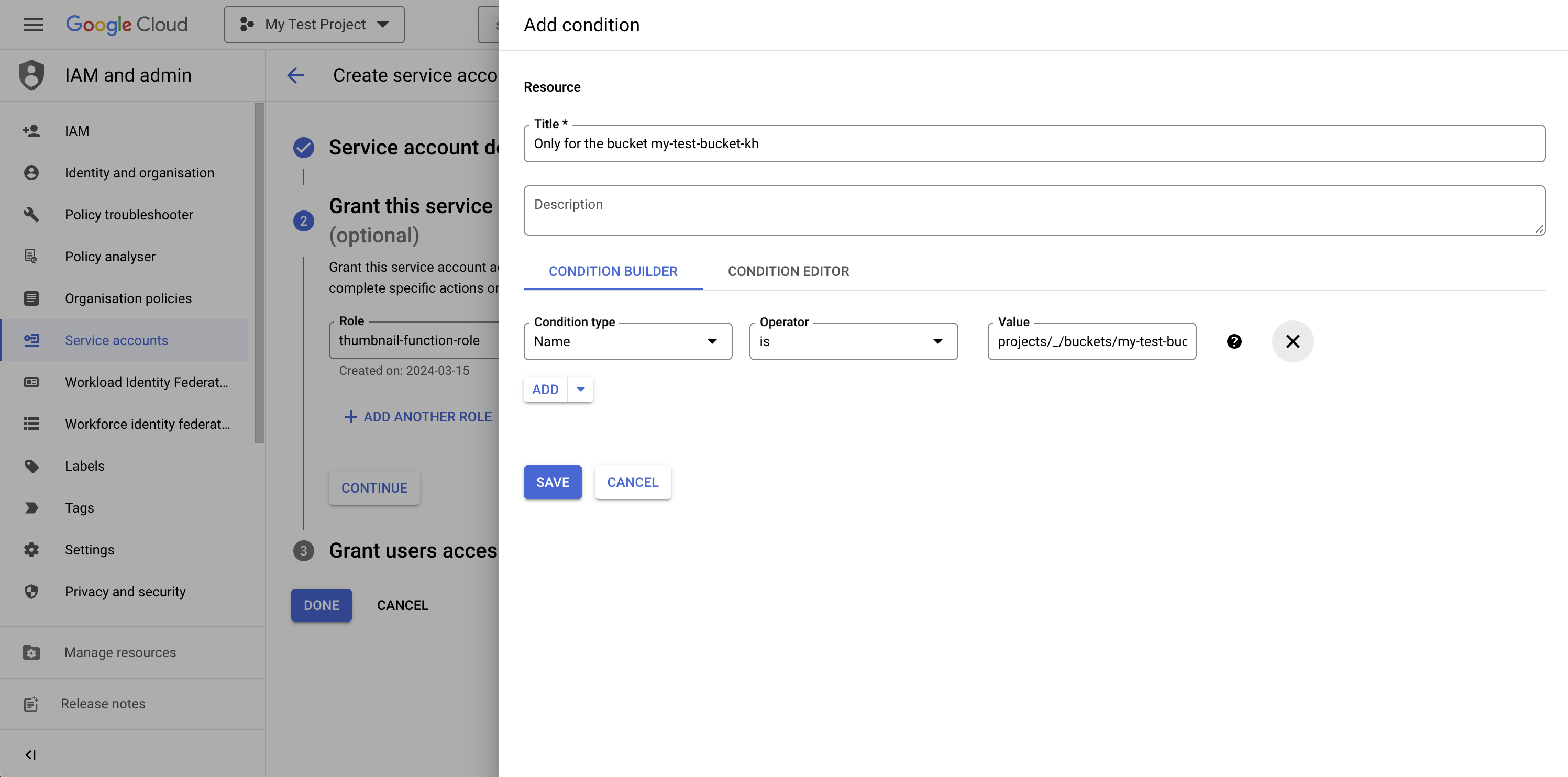 gcloud projects add-iam-policy-binding [PROJECT_ID] --member="serviceAccount:[SERVICE_ACCOUNT_NAME]@[PROJECT_ID].iam.gserviceaccount.com" --role="projects/[PROJECT_ID]/roles/ThumbnailFunctionRole" --condition='expression=resource.name == "projects/_/buckets/[BUCKET_NAME]",title=Only for the bucket my-test-bucket-kh'