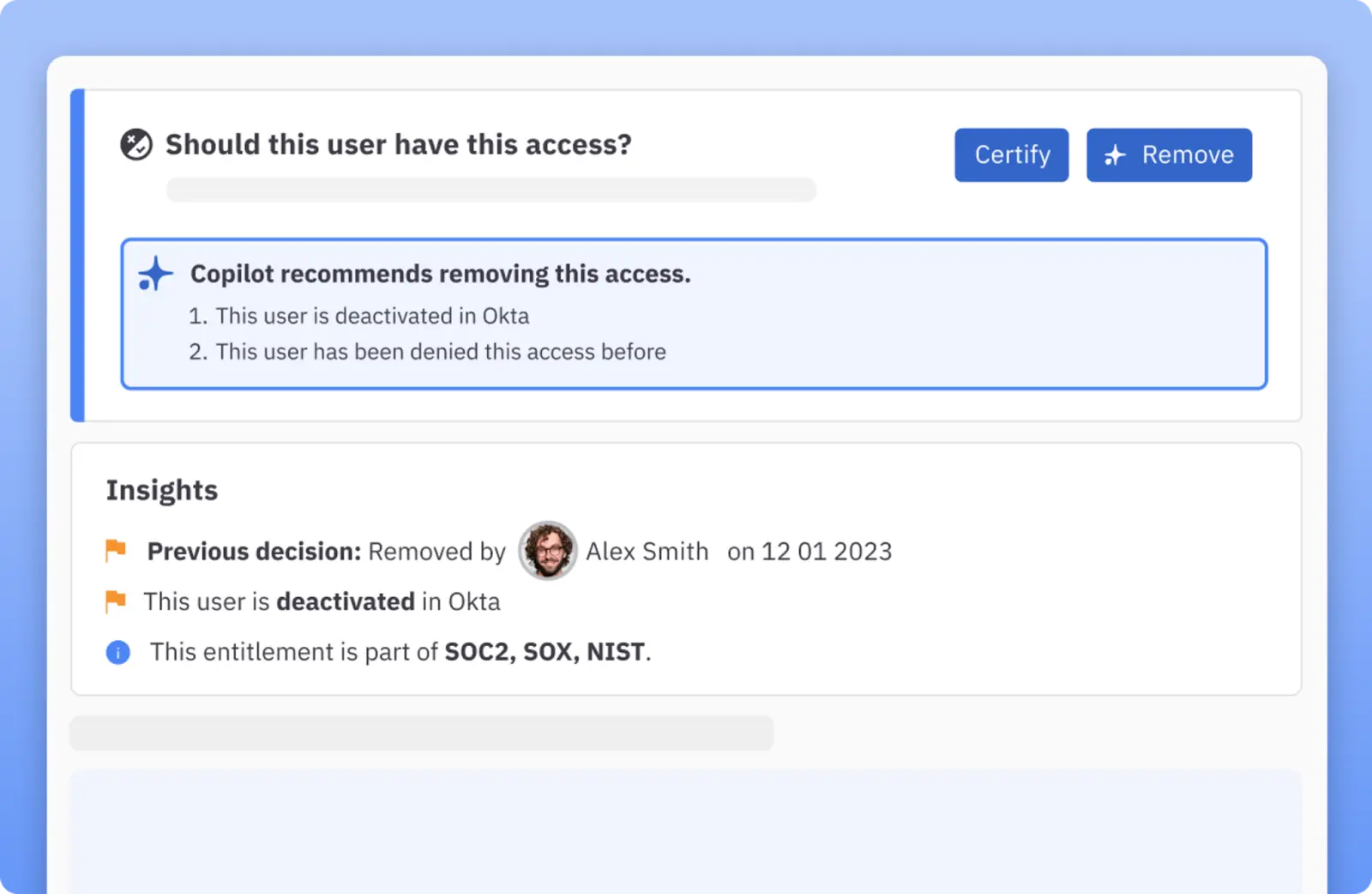 - Surfacing risk insights: Copilot highlights anomalies and risk signals across users, departments, roles, and entitlements. This visibility gives approvers the confidence to deny risky requests and approve low-risk ones quickly.