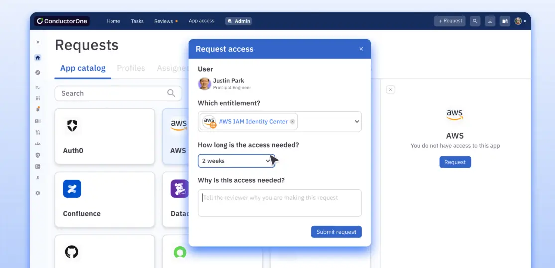 JIT removes the bottleneck of IT tickets. Users can request access via Slack, CLI, or a web portal, choosing from a catalog of pre-approved permissions. Because low-risk requests can be auto-approved based on policy, engineering teams maintain their velocity without bypassing security protocols.