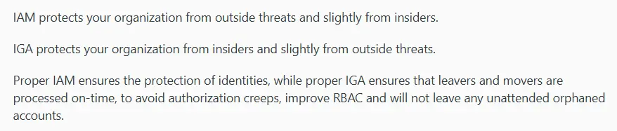 - IGA handles the governance side of access. It manages who gets access to what, how that access is approved, and whether existing permissions still make sense.