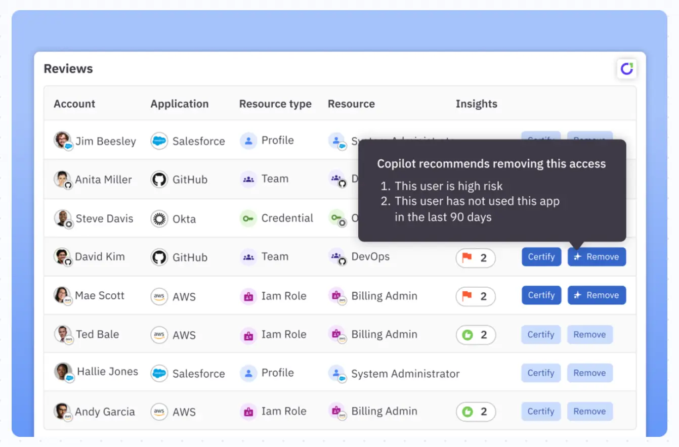 - Empowering managers with intelligent recommendations. We turn access reviews from a chore into a valuable governance function. Our platform provides managers with clear, AI-powered recommendations to help them make faster, more confident, and more secure decisions.