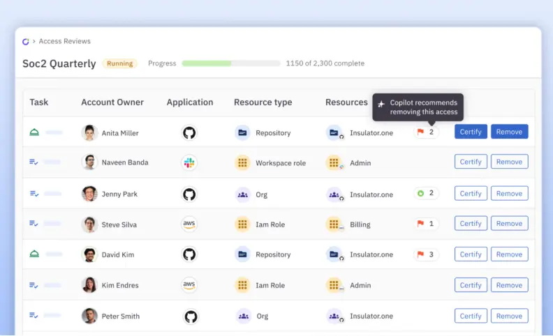 - Automated access reviews with built-in context: Run periodic reviews where sponsors confirm their contractors still need what they have. AI flags unused permissions and anomalies, and builds the audit trail your compliance team will ask for later.