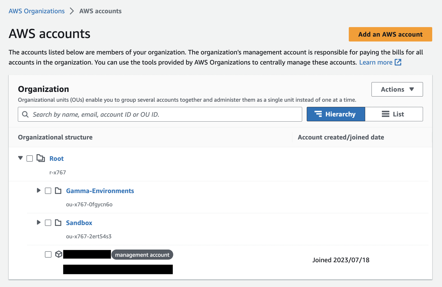 First, configure your organization. In AWS Organizations, an organizational unit (OU) is a group of accounts that share the same access control policies. In the following screenshot, there are two OUs: Sandbox and Gamma-Environments.