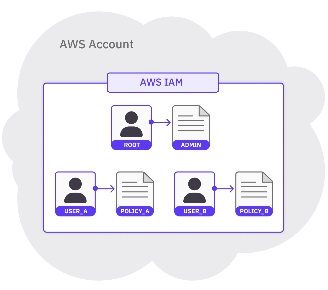 The diagram above depicts 3 IAM users in a single AWS account. Each user consists of a name (i.e., root, user_a, or user_b) and a set of credentials. The credentials are represented by an IAM policy that's attached to each user. The policy (i.e., admin, policy_a, or policy_b) defines the actions that the user is allowed to perform within the account. Whenever you log into an AWS account, you log in as a specific IAM user.