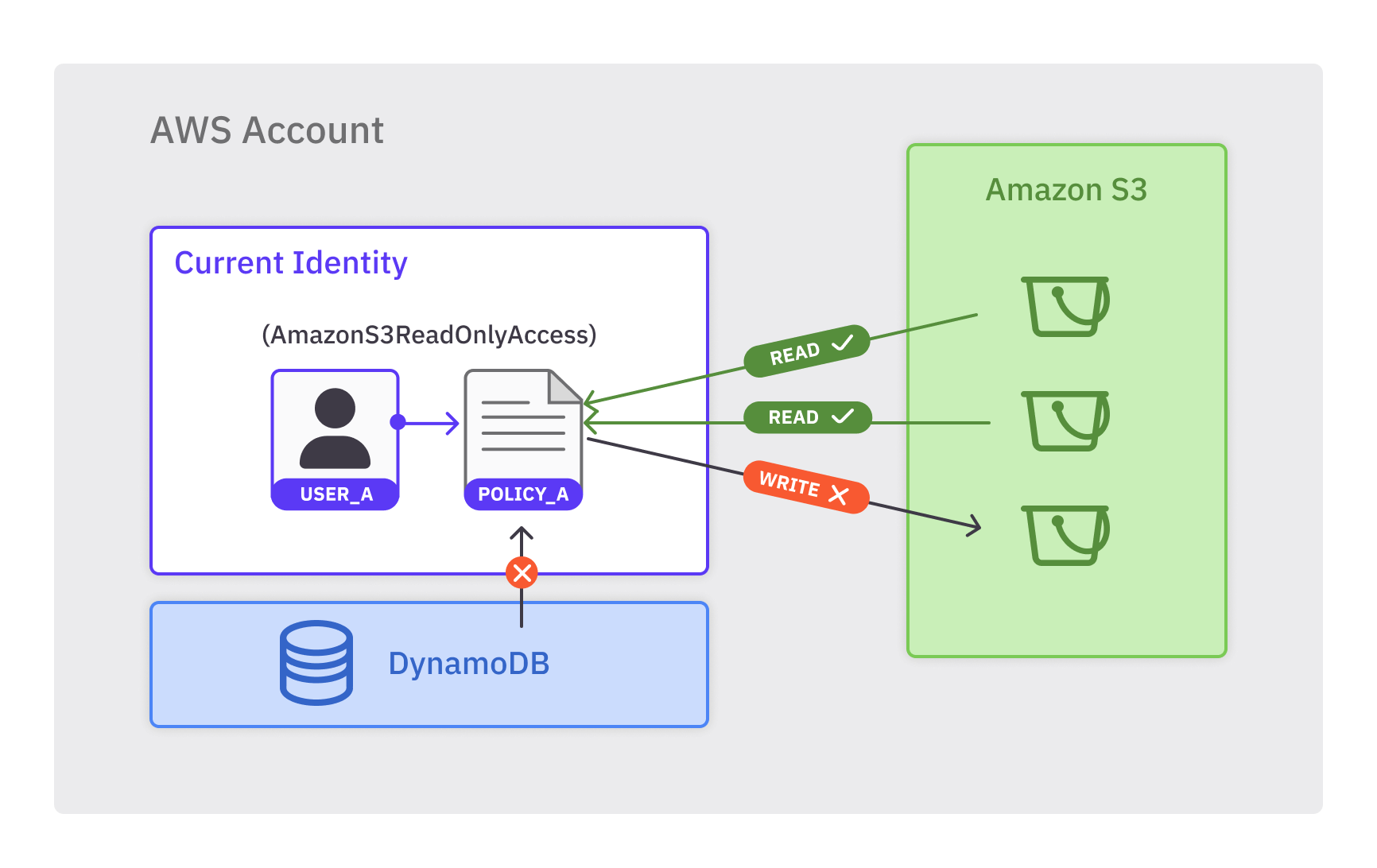 user_ais allowed to performREADactions on S3 buckets.user_ais not allowed to performWRITEactions on S3 buckets.user_ais not allowed to perform any actions on any other services (i.e., DynamoDB).
