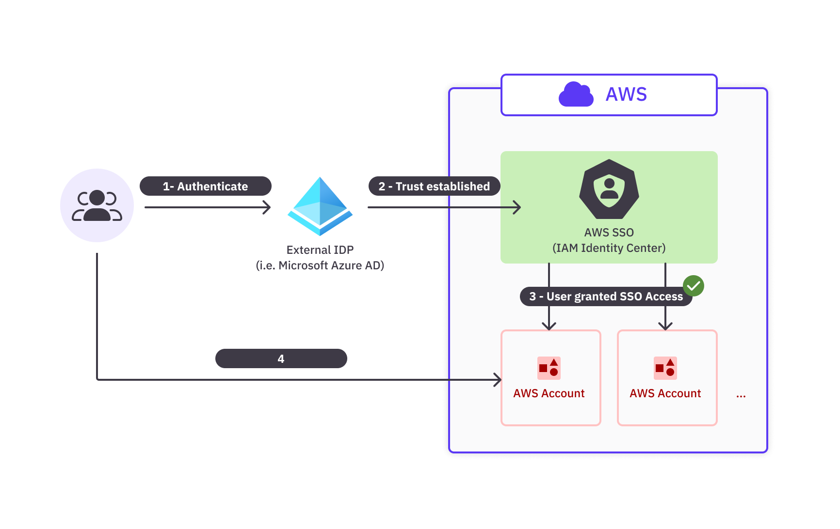 - The user can then access any of these AWS accounts and applications without having to log in separately or manage different AWS credentials for each account.