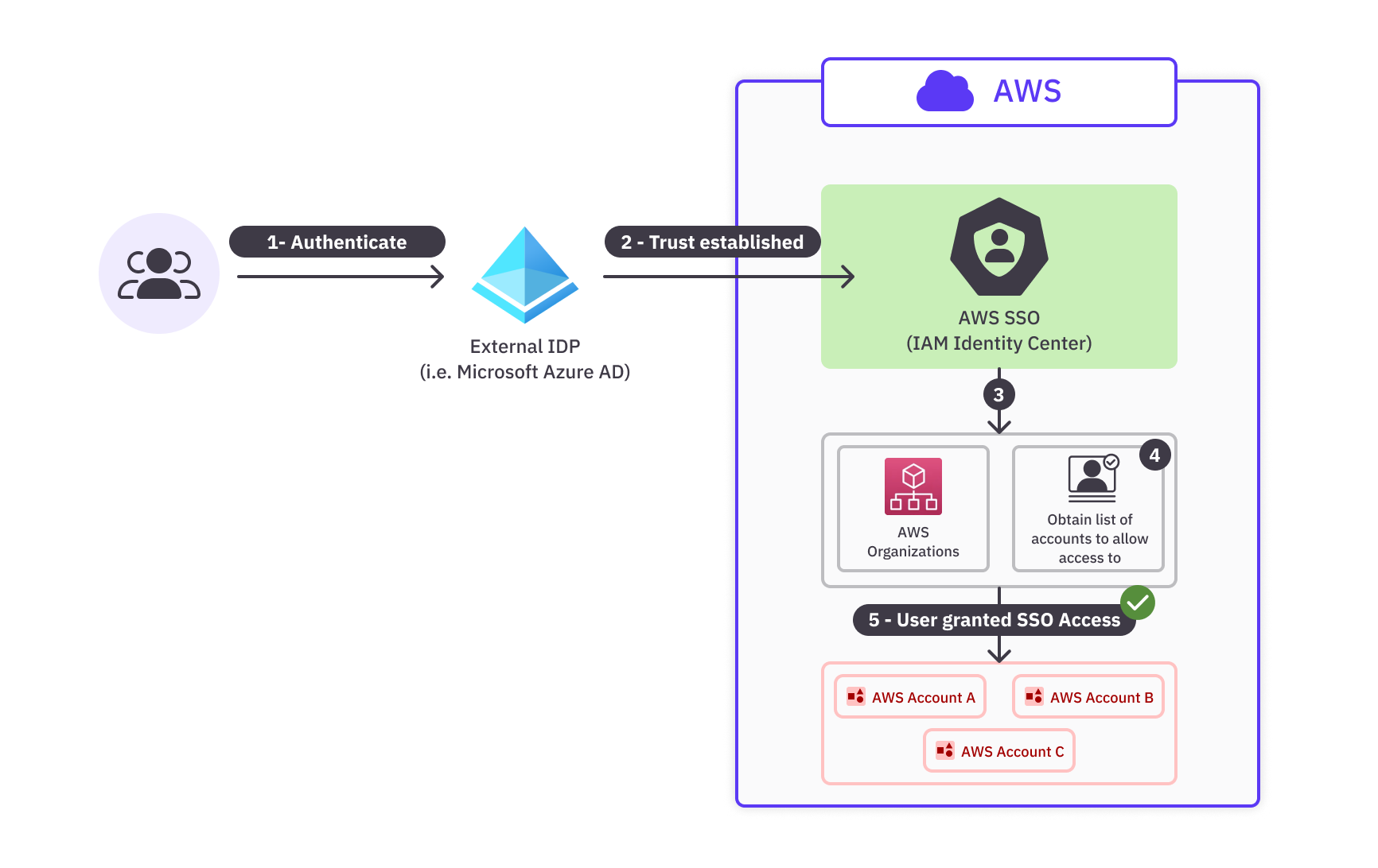 As its name implies, in an SSO model, once the user is authenticated by an Identity Provider (IdP), they gain access to all the AWS accounts they are authorized to access without having to sign in multiple times. This eliminates the need to manage separate IAM credentials for each individual account, and greatly simplifies the authentication experience.