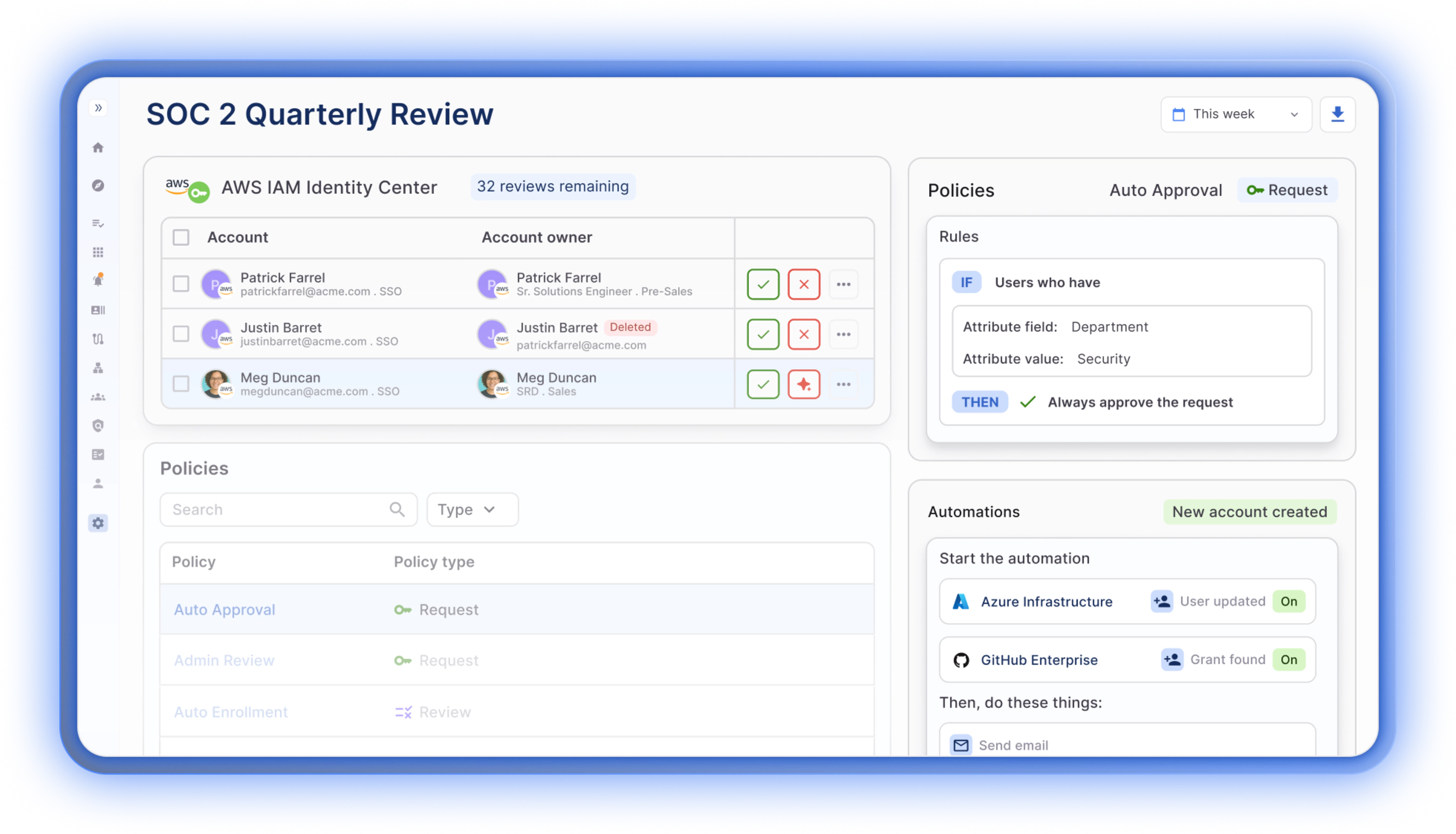 Automated Access Reviews and Certifications — Manual spreadsheet-based reviews are slow, error-prone, and create reviewer fatigue. Modern platforms automate the access review cycle end-to-end, surface risk signals and usage patterns for each decision, and enforce remediation on a defined schedule.