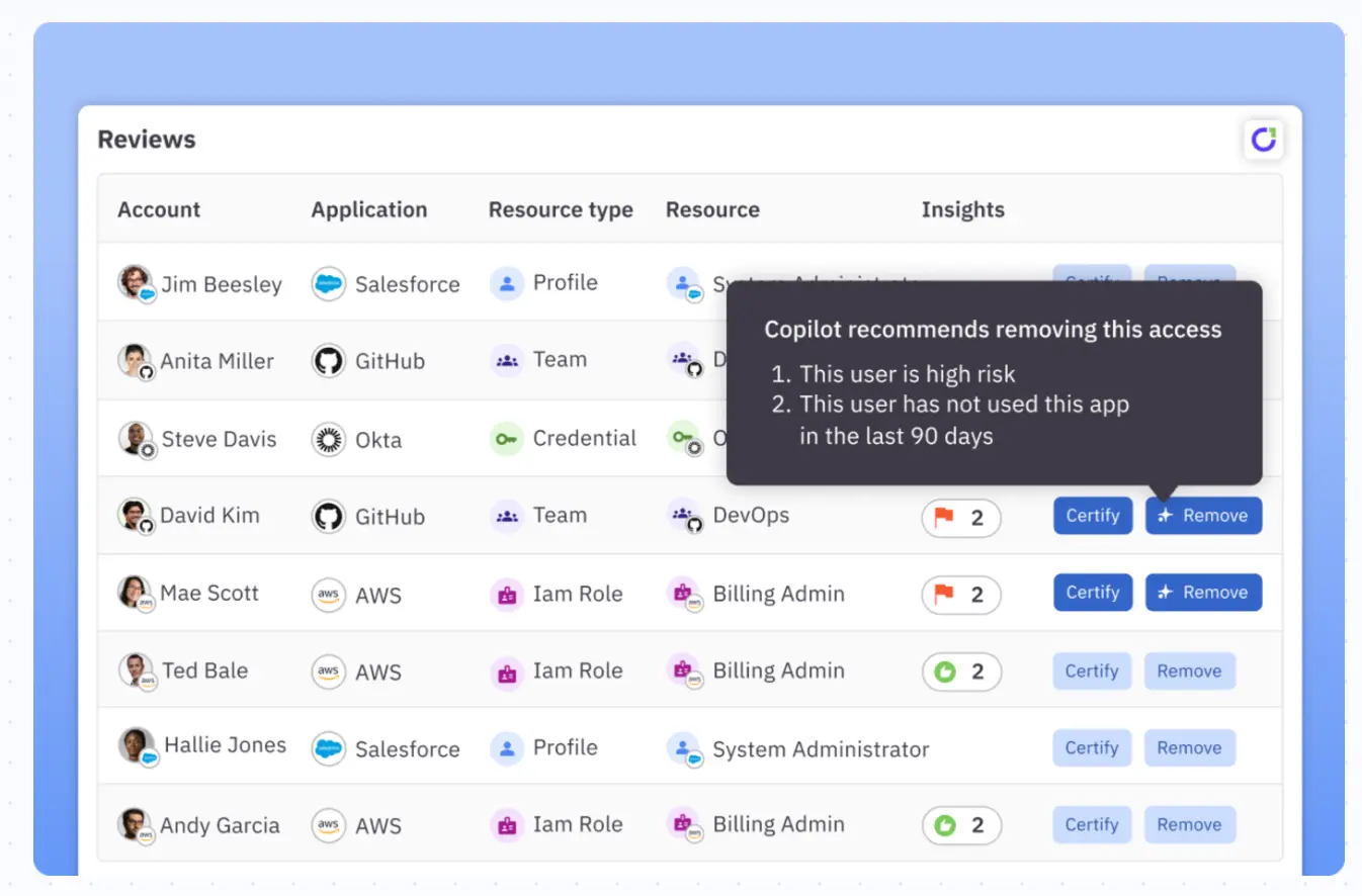 - Intelligent access reviews: Our AI doesn't just recommend revoking unused access; our agents can automate the entire process, from gathering data and making recommendations to executing the final revocations after human approval, ensuring the governance loop is always closed.