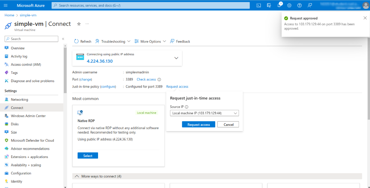 You can do the same in the settings for your virtual machine. Click Connect in the left-hand menu for your VM, then use the Request access option to request just-in-time access: