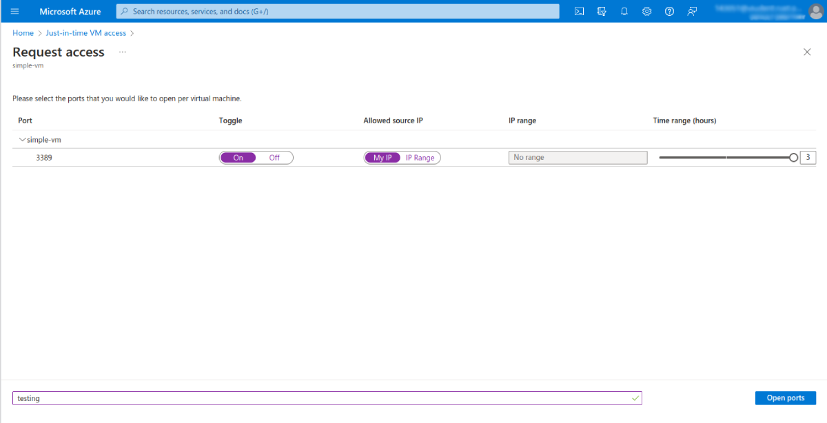 Now that you’ve enabled JIT access and configured ports for JIT VM access, you can request access to your VM. Back on the Just-in-time VM access page, select the desired VM from the Configured list to do this. Then, click Request access: