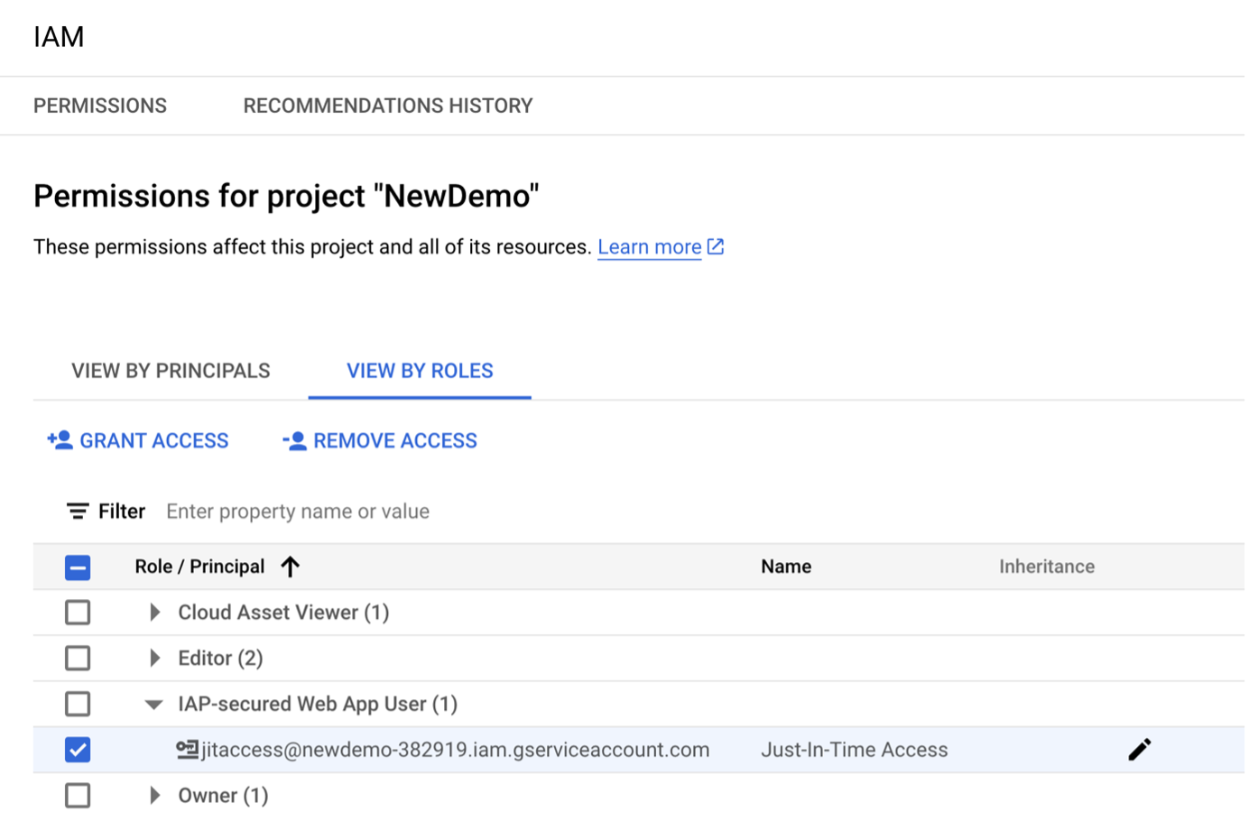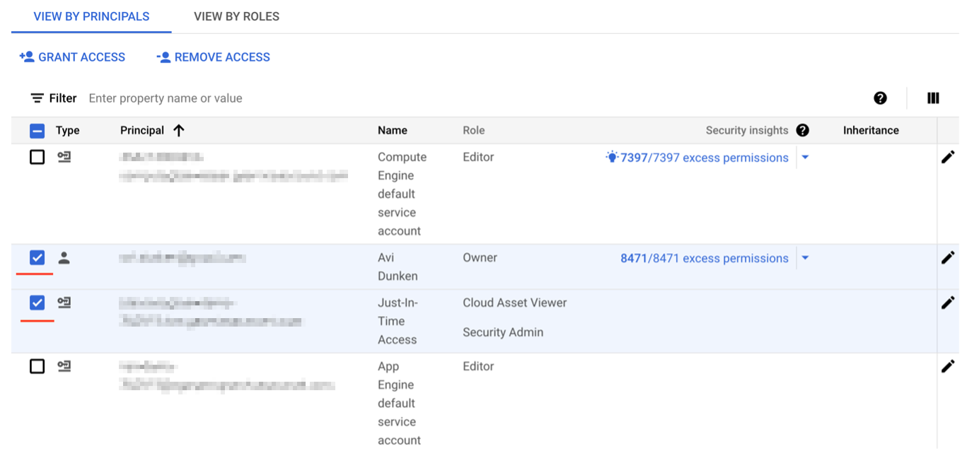 Back in the console, navigate to IAM & Admin section, and, under IAM, click GRANT ACCESS. Then, select users, groups, or domains in the list of principals by clicking the checkbox to the left of each item:
