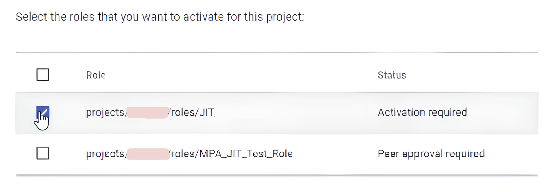 Select a role for which you want to activate access in the JIT Access application: