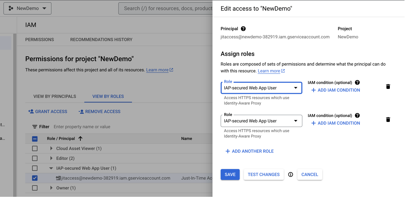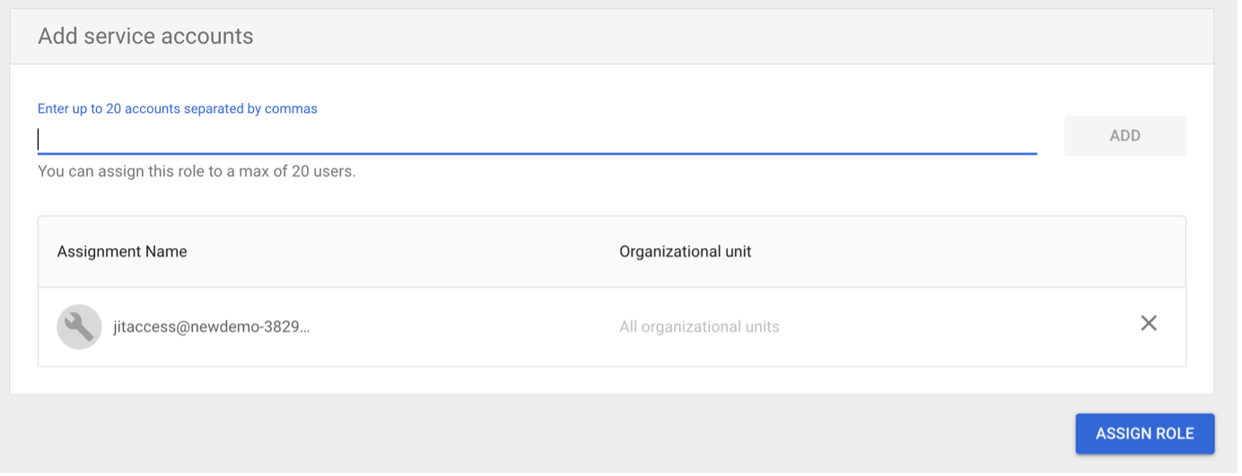 Enter "jitaccess@newdemo-382919.iam.gserviceaccount.com", replacing "newdemo-382919" with your project name, then click ADD, followed by ASSIGN ROLE: