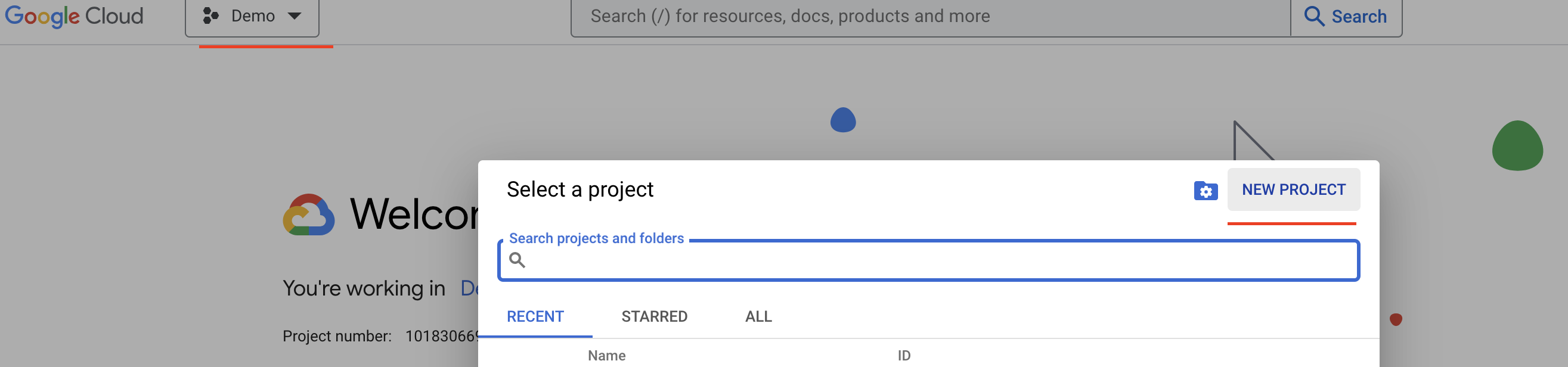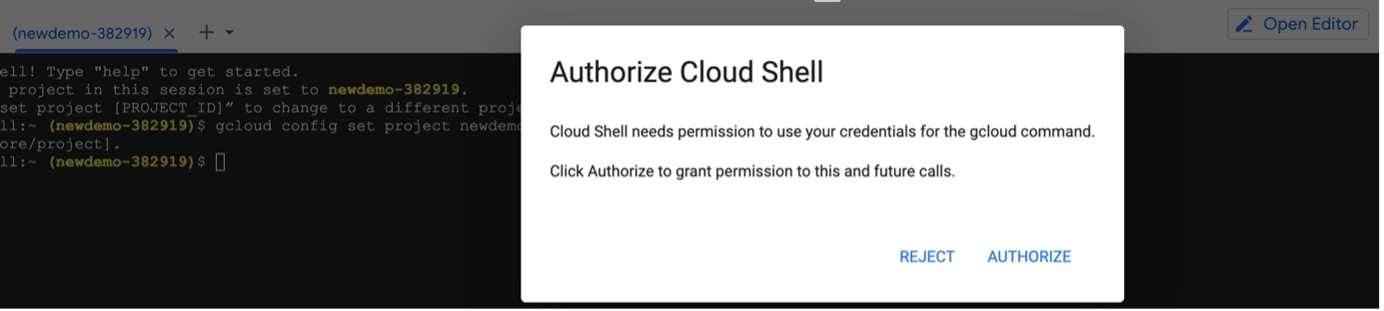 Open Google Cloud Shell and set the environment variable for your project. Run the following command, replacing "newdemo-382919" below with your project name if you used a different name: