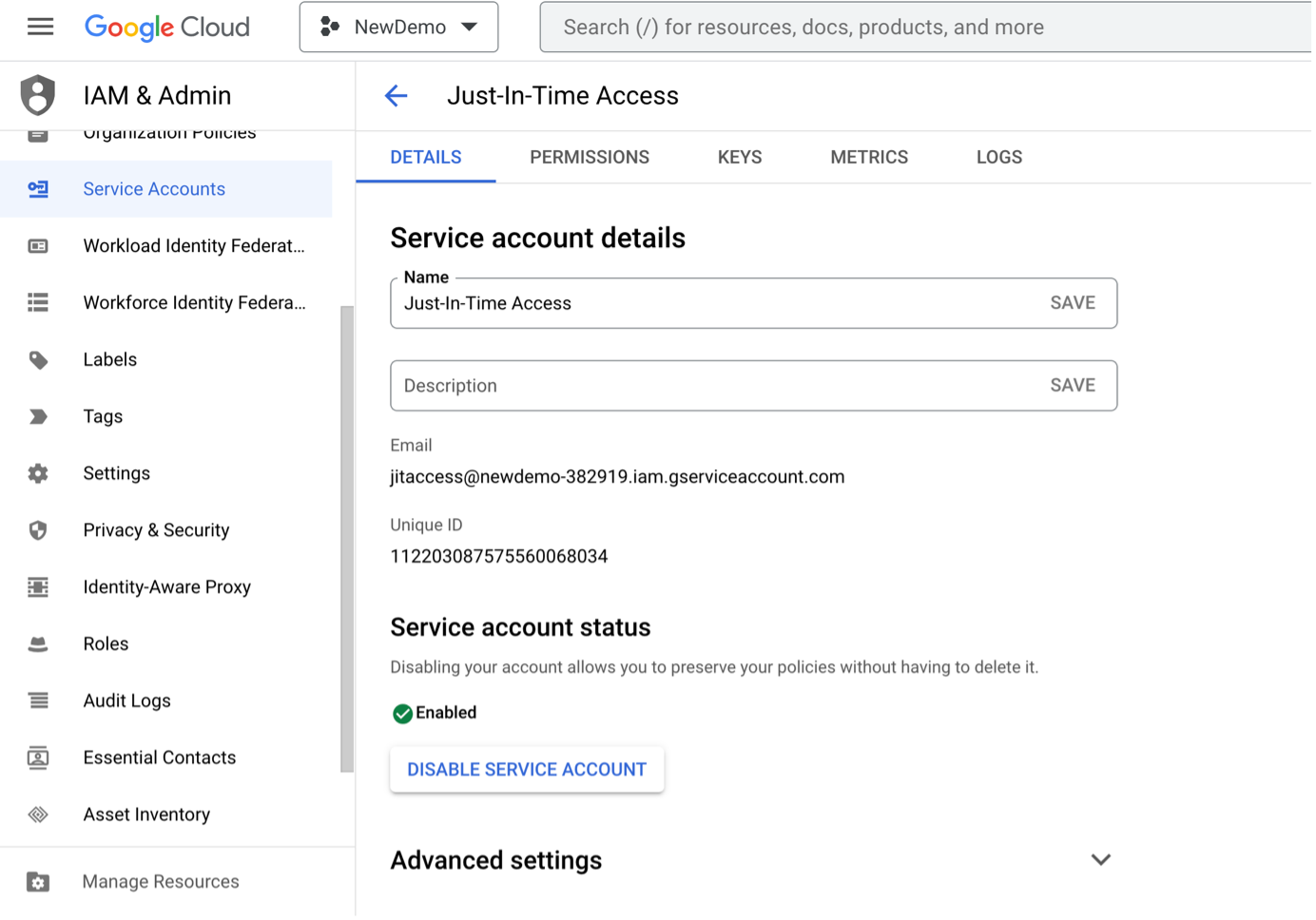 To verify this, navigate to the IAM & Admin page in the GCP console and click Service Accounts. You can see that the “Just-In-Time Access” service account has been created and enabled: