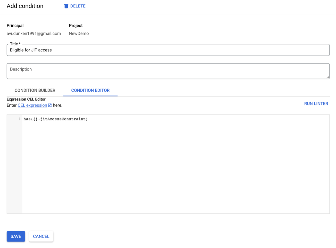 Add a descriptive title for the condition, such as “Eligible for JIT access.” Next, click CONDITION EDITOR and enter the CEL expression below: