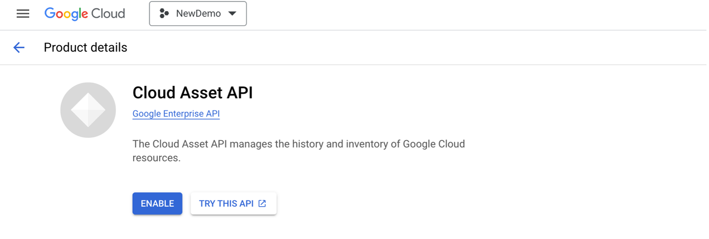In the search bar, enter the name of the API you want to enable (for example, “Cloud Asset Inventory”):