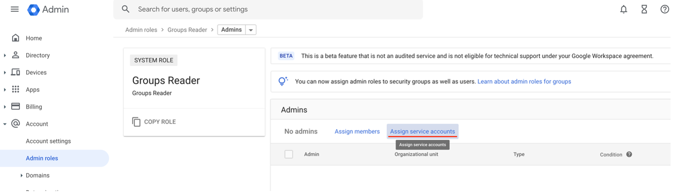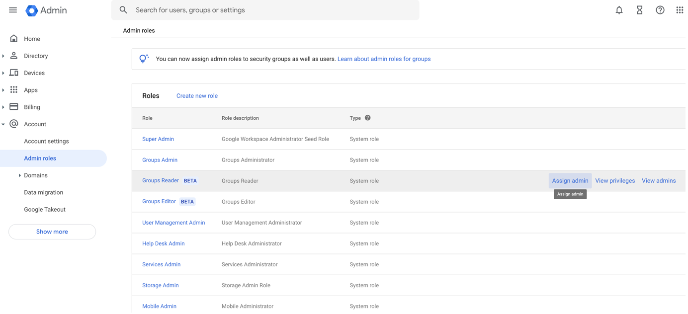 Then, under the Groups Reader role, click Assign admin: