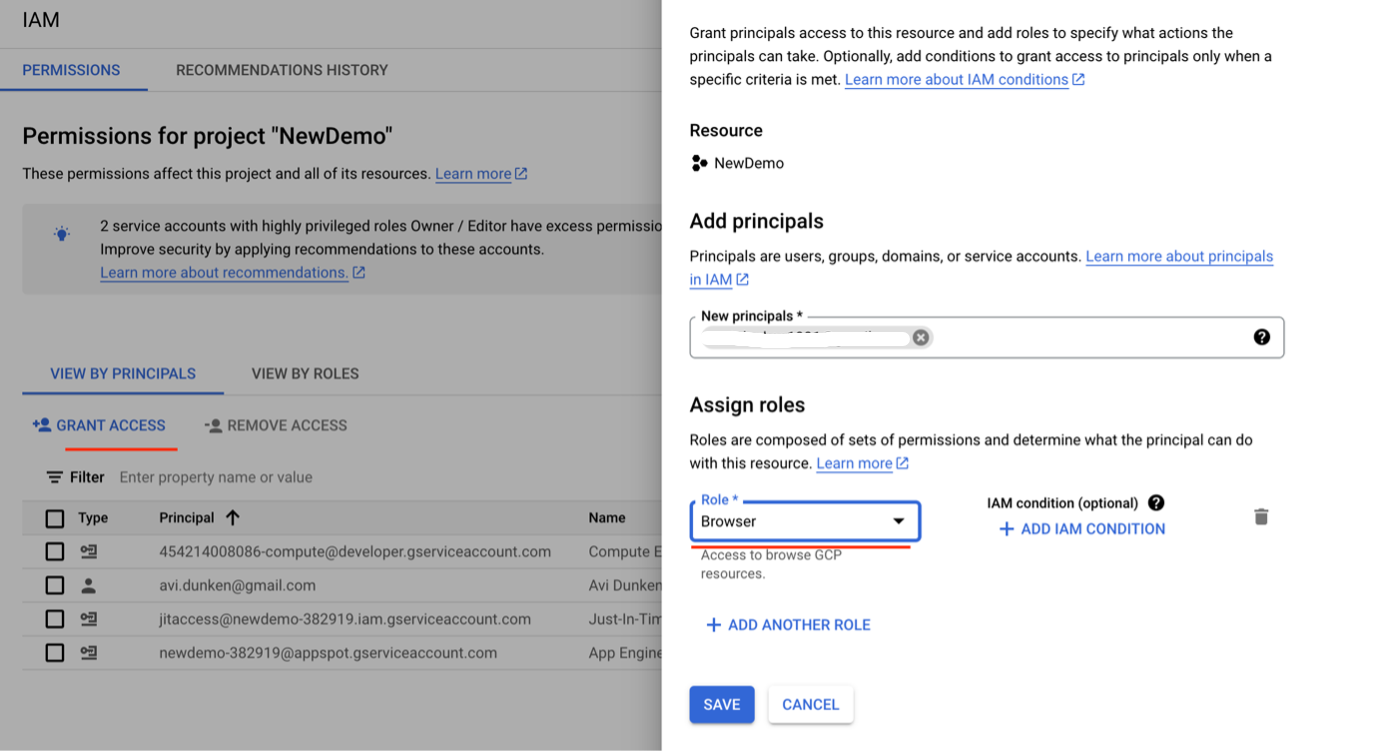 Then, click ADD IAM CONDITION, enter an email ID in the New principal input field, and under Role, choose Browser.