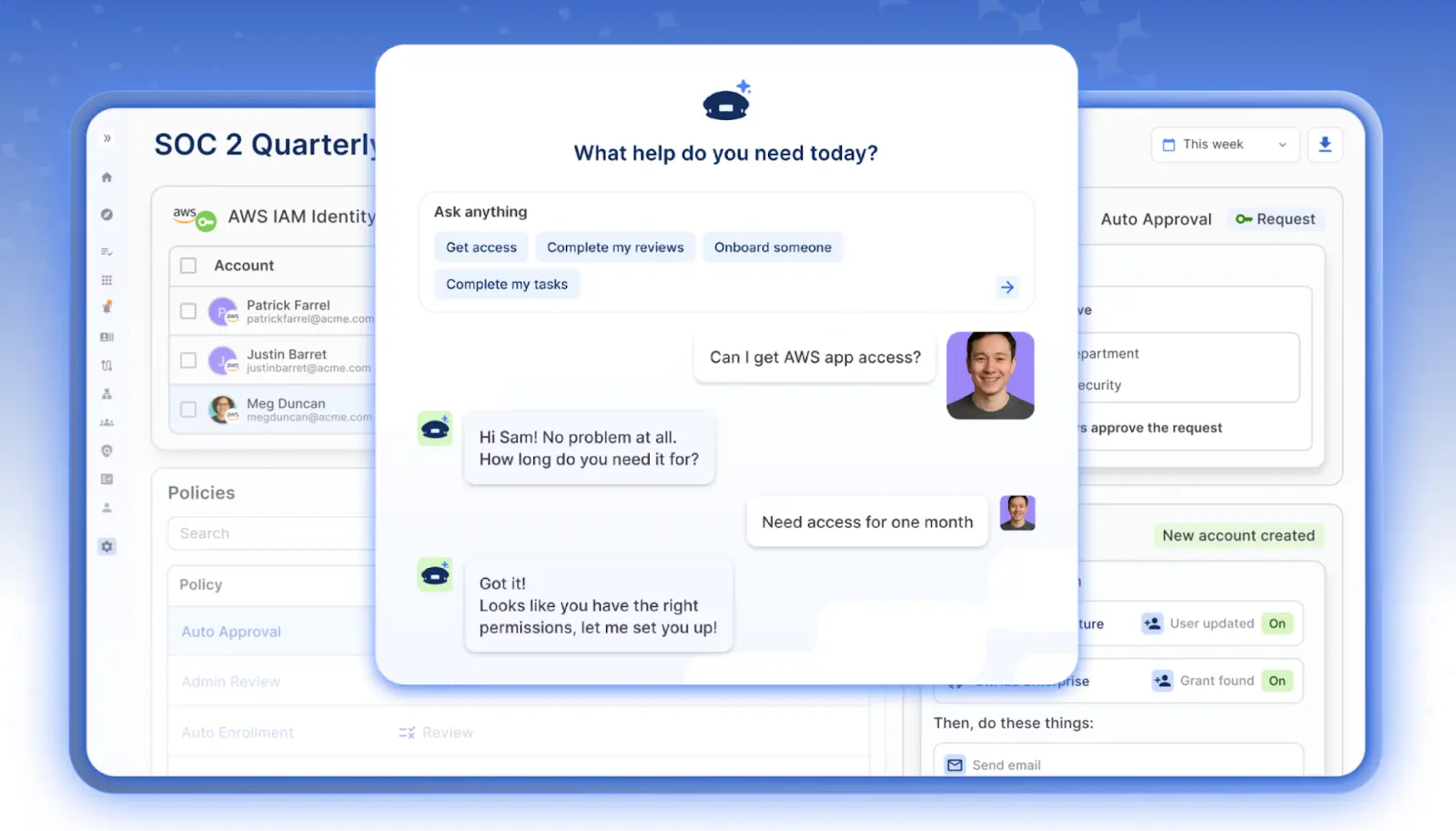 You also get a powerful policy engine and AI agents that can handle routine access decisions based on your security policies, so your team can focus on exceptions and high-risk cases instead of approvals.