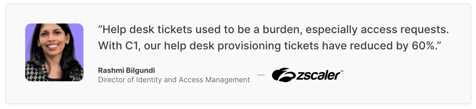 And because the platform works alongside your existing IdP, the switch doesn't require a full identity overhaul. Zscaler integrated C1 with Okta and saw new hire provisioning drop from weeks to 10 minutes. Plus, a 60% reduction in provisioning-related help desk tickets.