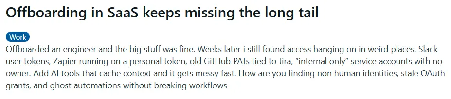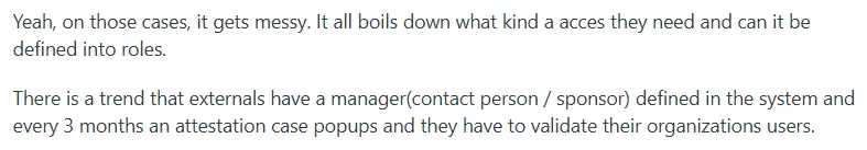 The approach: Every non-employee identity needs a single accountable owner inside the organization before access is granted. This sponsor becomes responsible for the relationship, the access, and the eventual offboarding. Some organizations already operate this way. As one user described on Reddit: