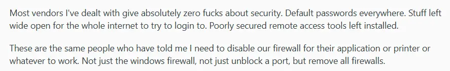 The uncomfortable truth is that many vendors don't treat security with the same rigor you do. One user shared a common experience: