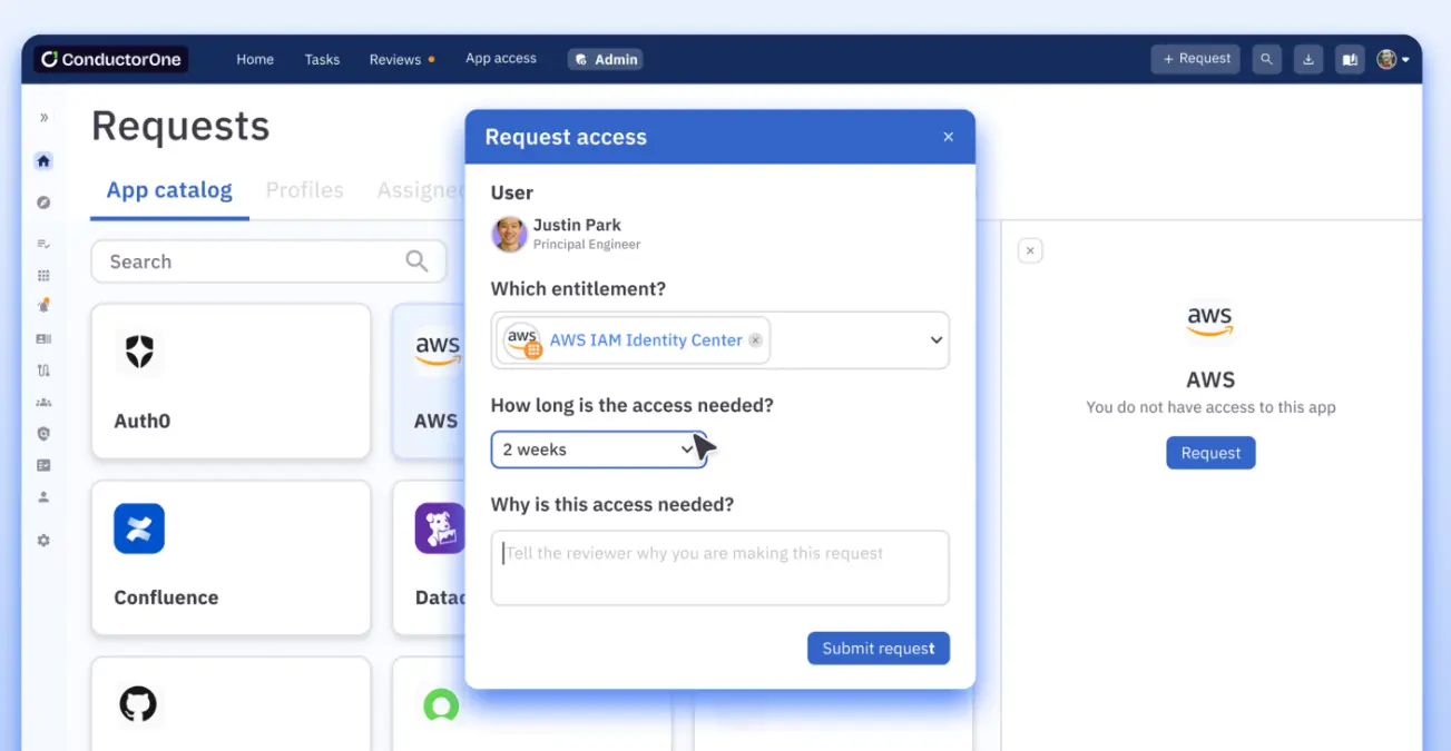- Self-service requests: Vendors can request access through Slack, a web portal, or the command line. Approval workflows route the request to the right person automatically.