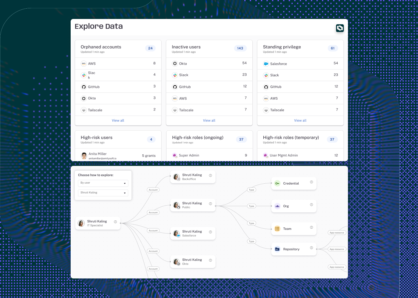 The identity graph is your single pane of glass for human and non-human identity and access visibility. Visualize access paths, identify risky access, and remediate with a click.